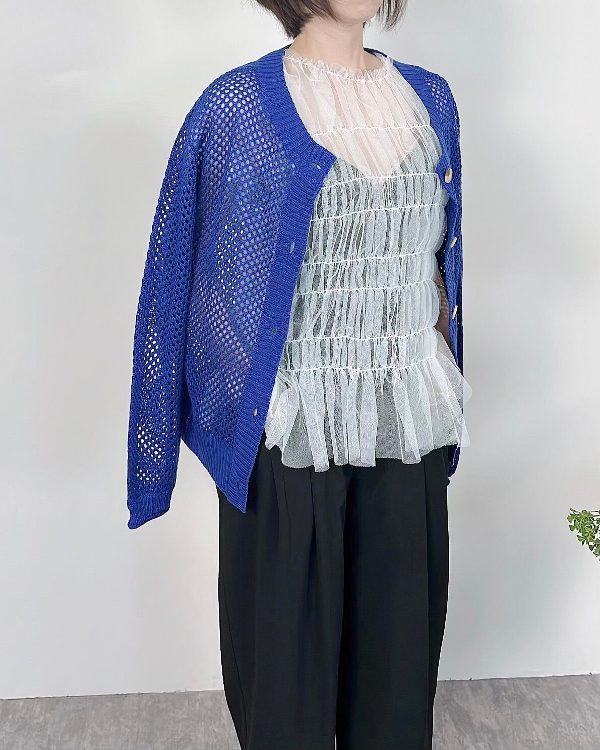コットン素材のような肌触りのニット素材でトレンドのメッシュ素材のニットは、カジュアルなデニムスタイルなどにさらっと羽織れば旬のスタイリングに。