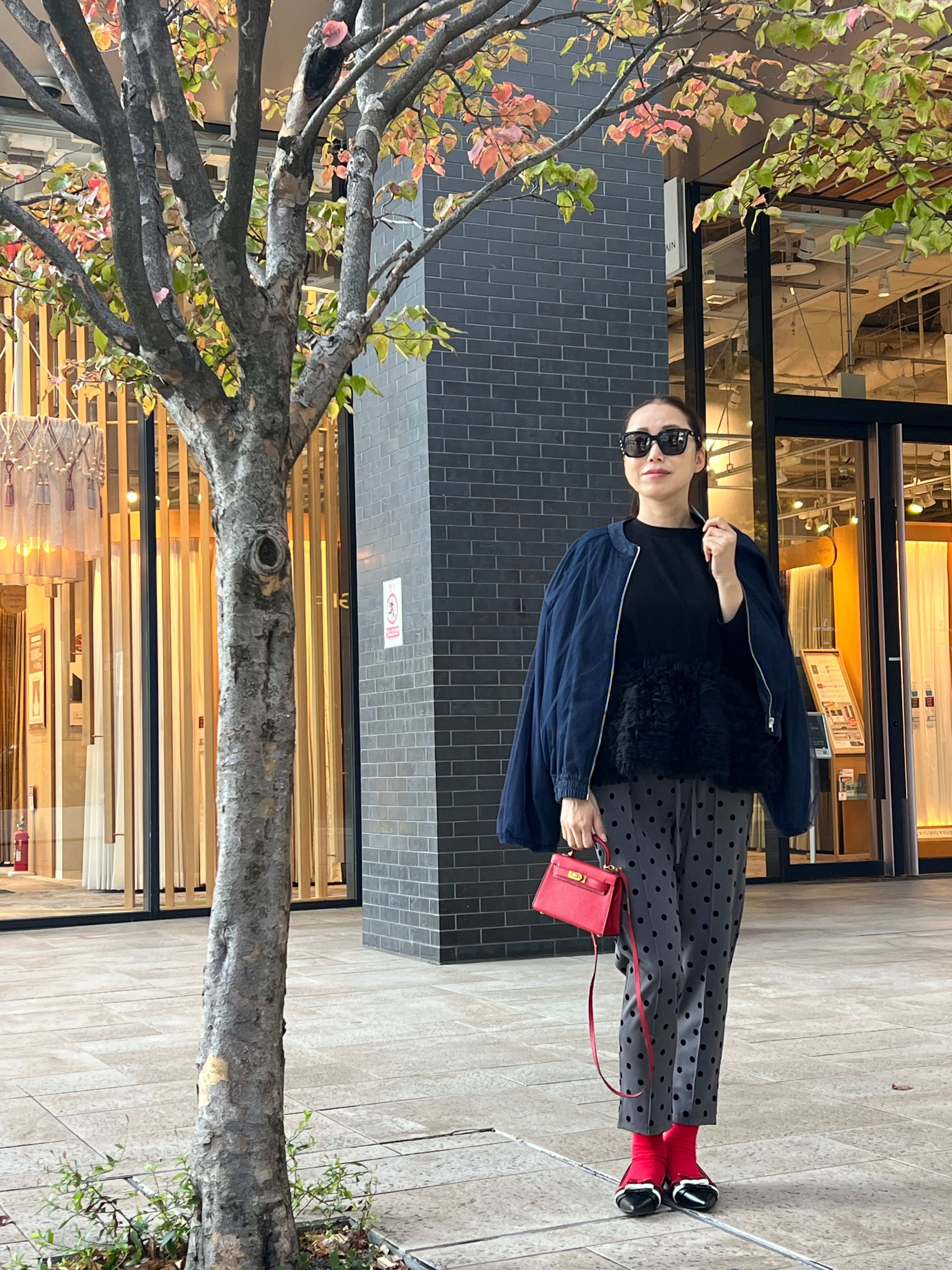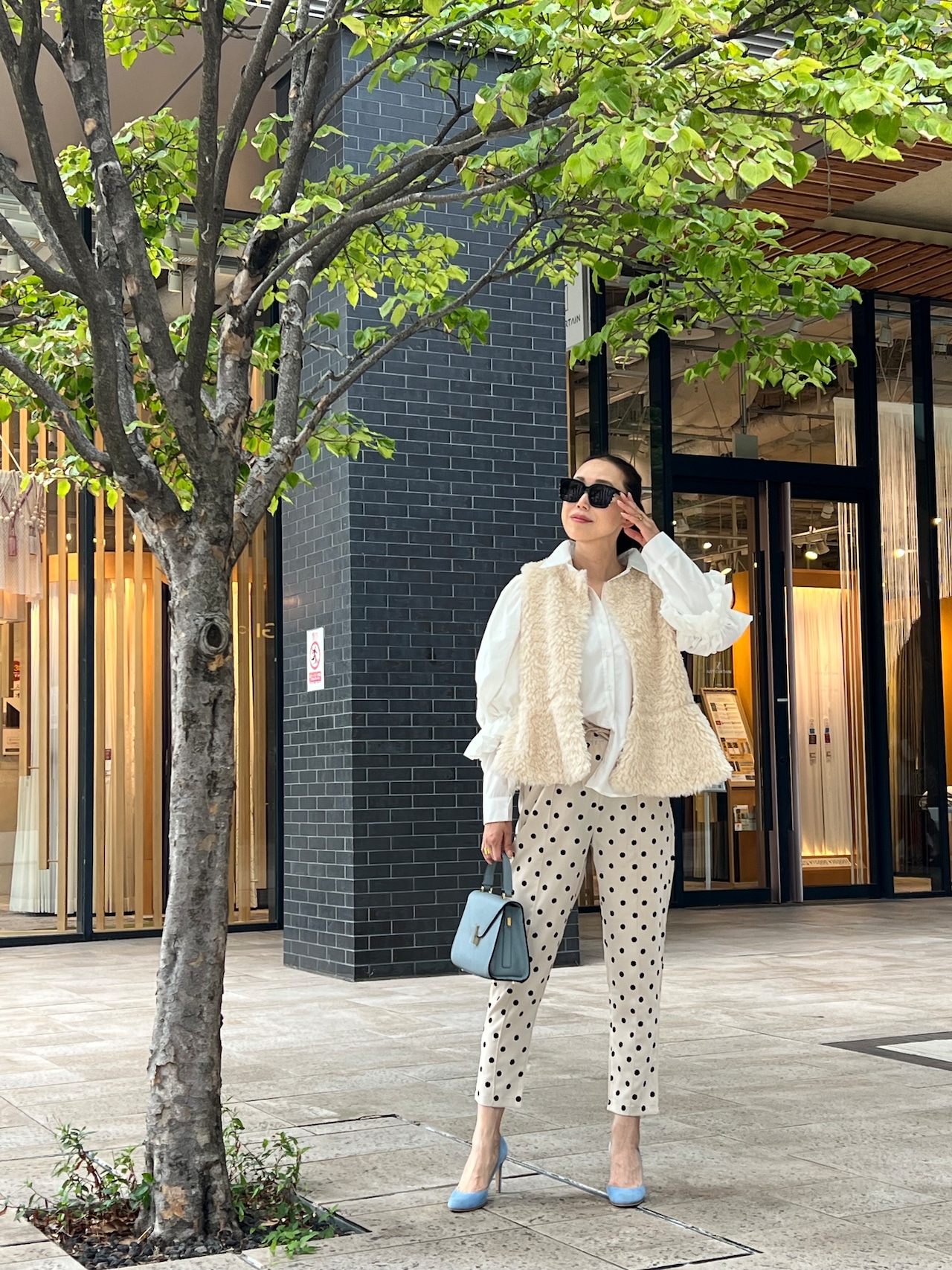 ドット柄のセンターラインありの綺麗目に履けるテーパードパンツです。