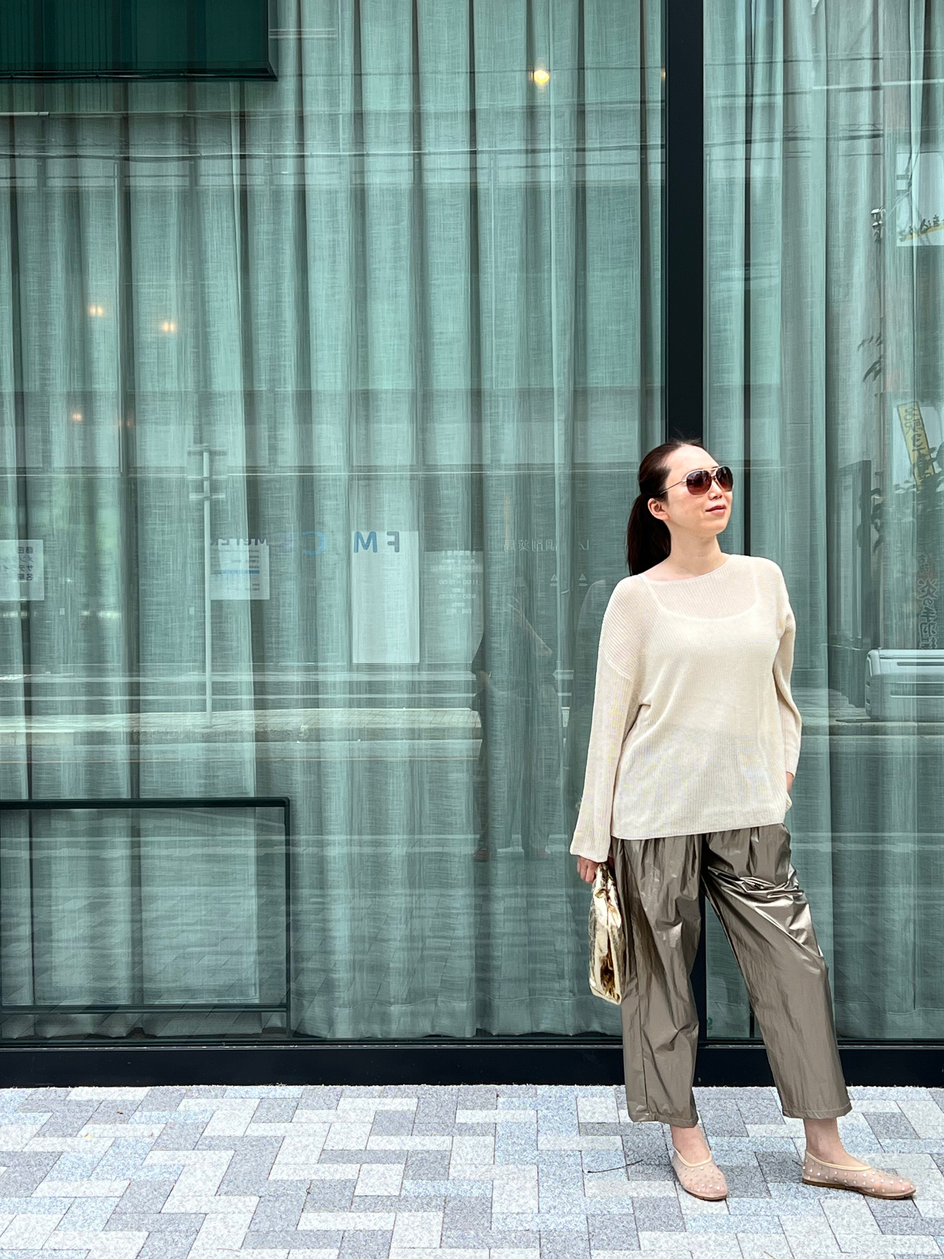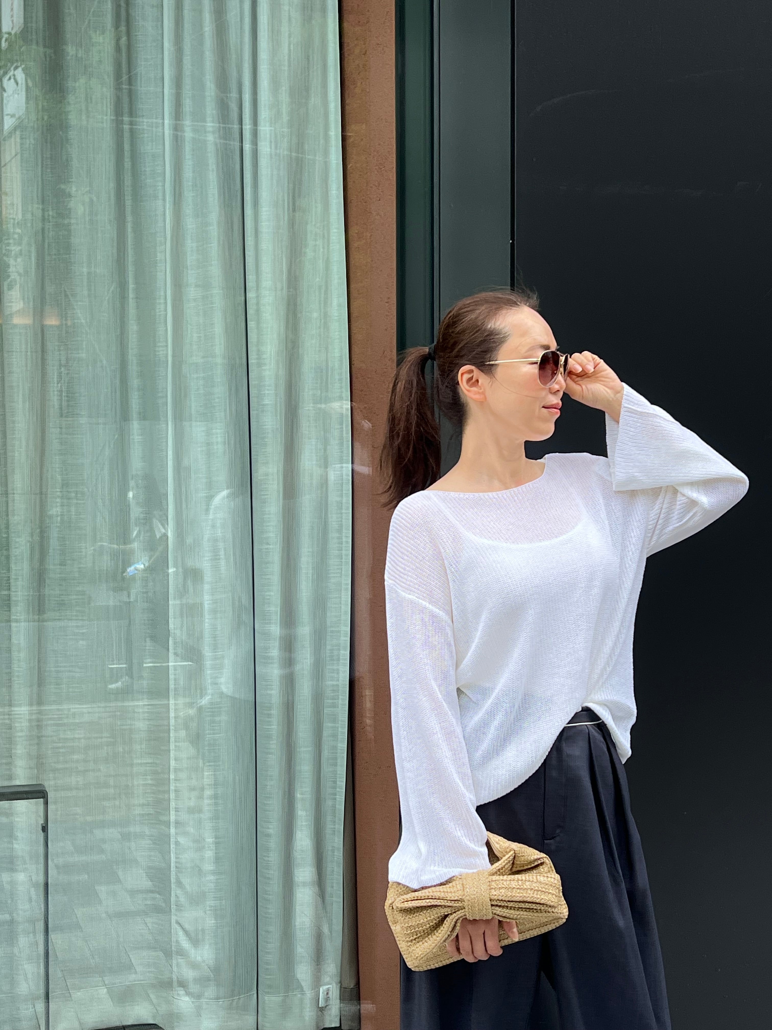 ドロップショルダーのシルエットで女性らしくゆるっと楽に着られて、カジュアルにもフェミニンにも重宝するニットプルオーバーは着回し力抜群。