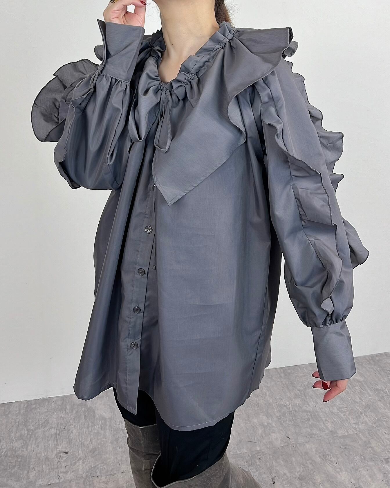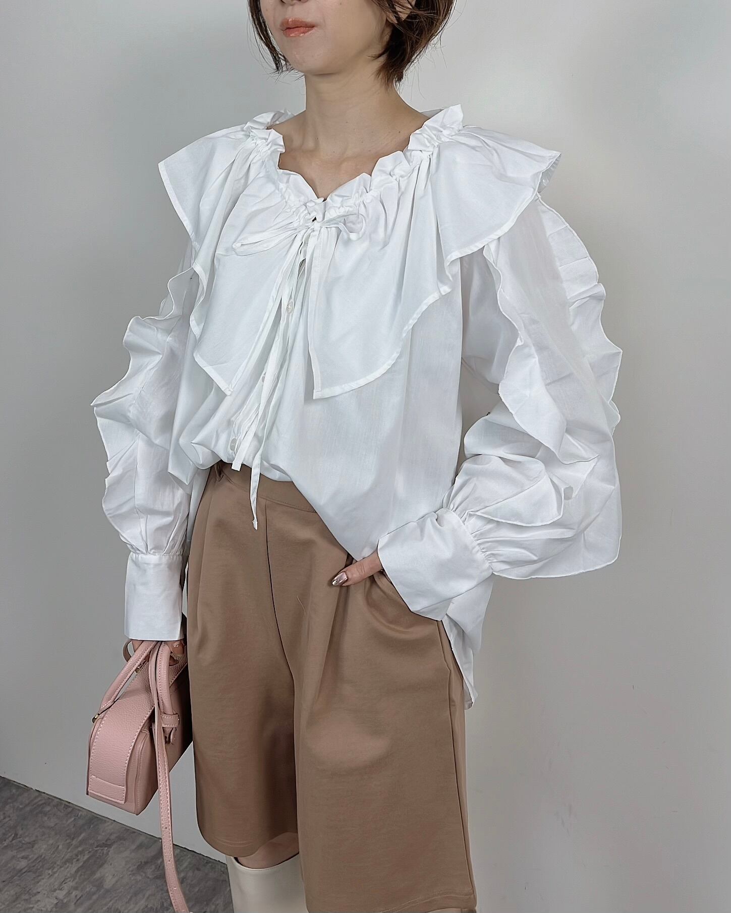袖には縦にラッフルフリルを施し、動くたびに揺れる華やかなシルエットが◎