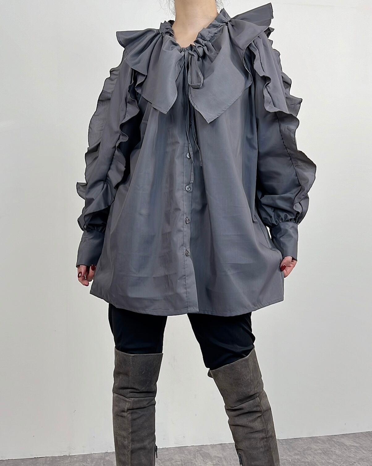広幅のラッフル衿はフロントのリボンでギャザー量を調整し、お好みのボリューム感を楽しめます。
