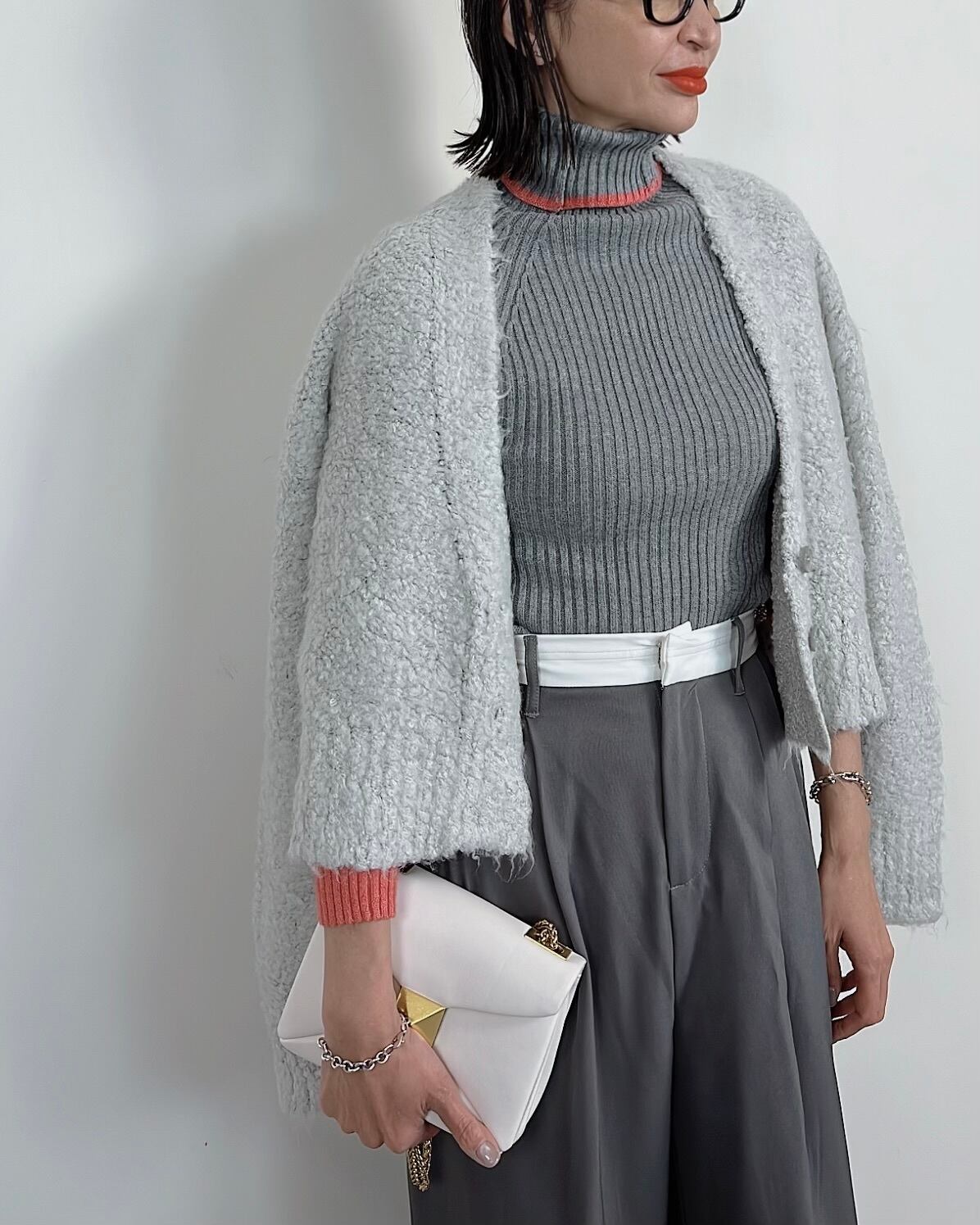 ゆったりとしたシルエットのブークレー素材が印象的なニットカーディガン。