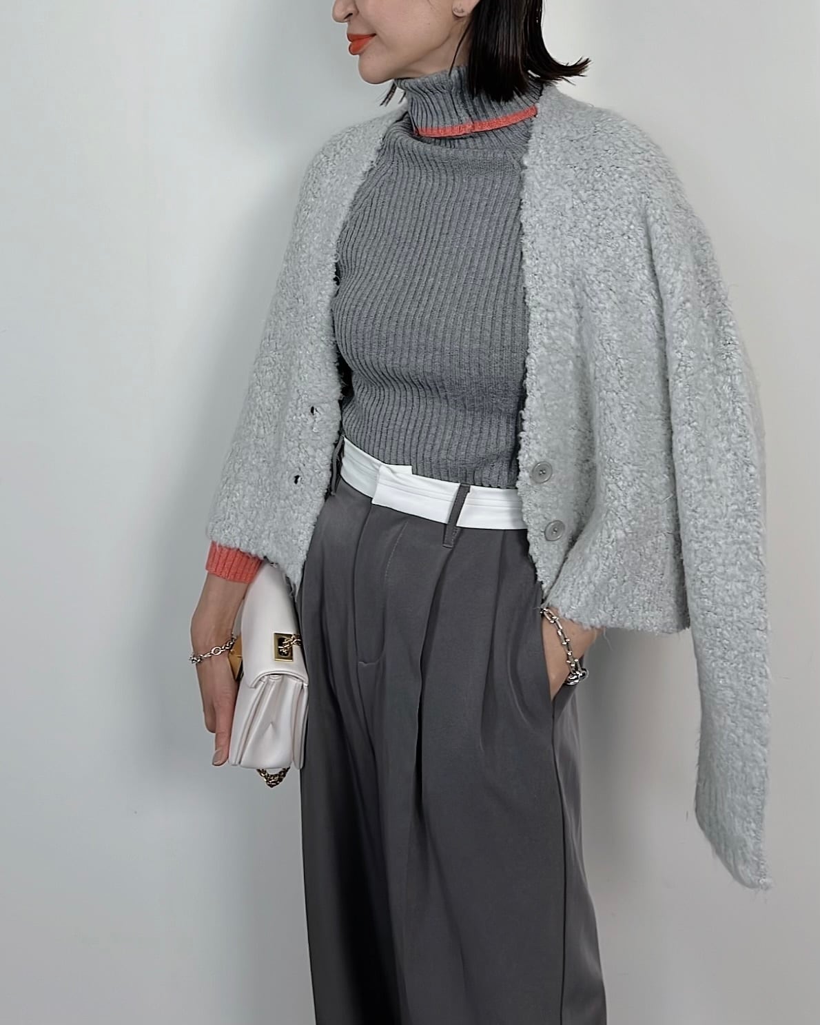 暖かみのあるブークレーニットでシーズンムード高まるショートカーディガン