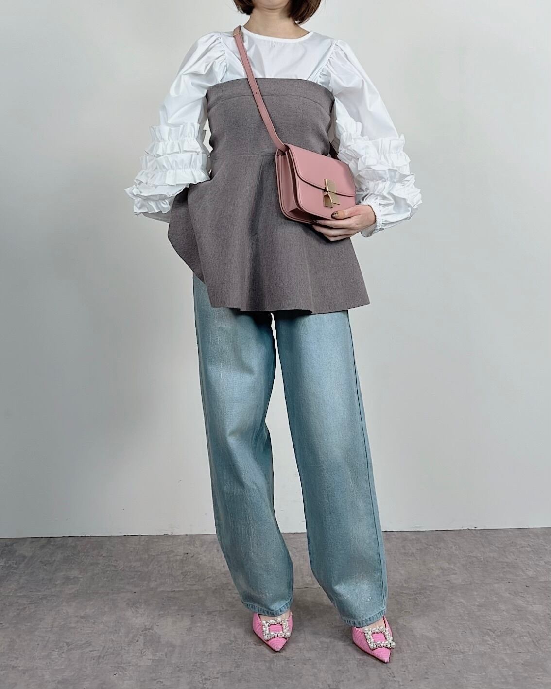 ベアトップで、ペプラムでと今のトレンドのいいところが目いっぱい詰まった、ヘルシーな大人の抜け感を演出!