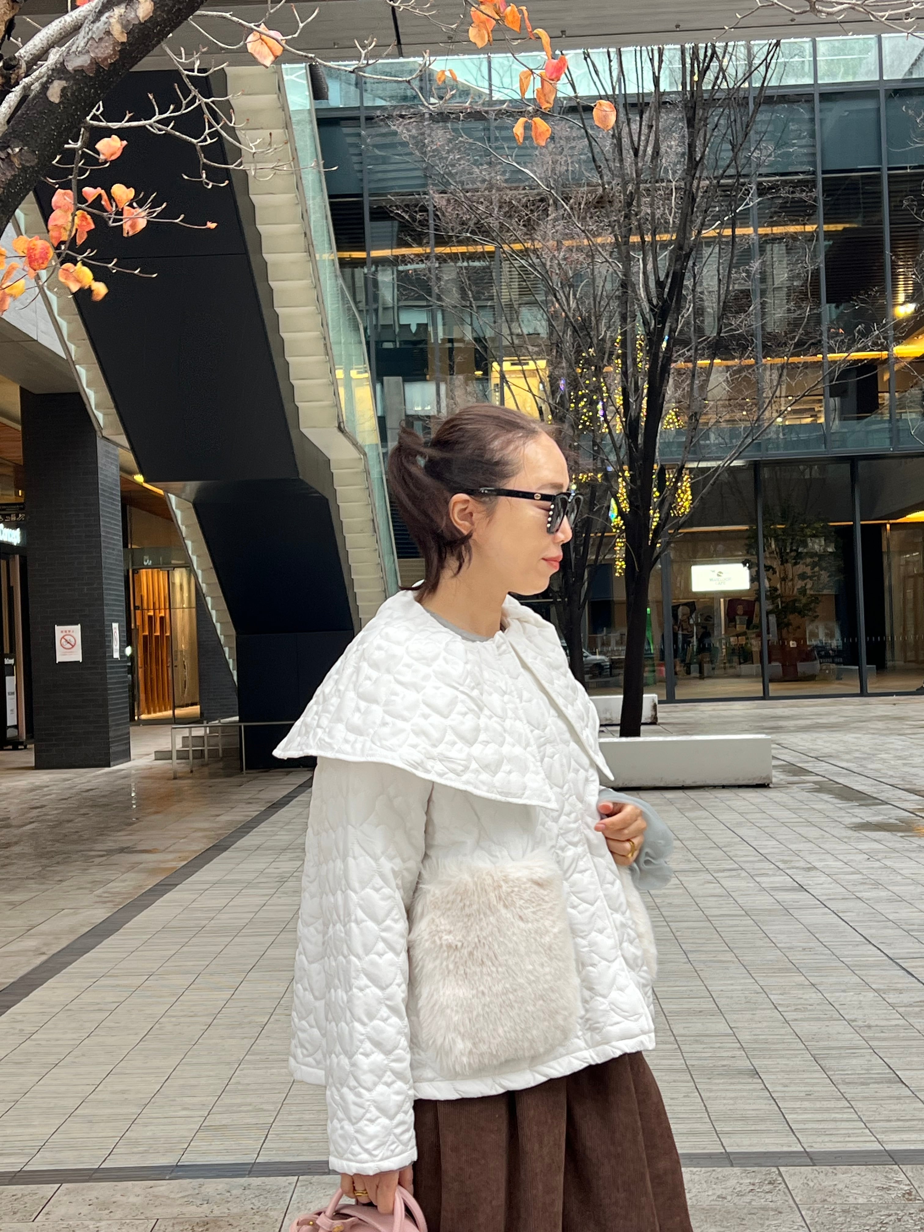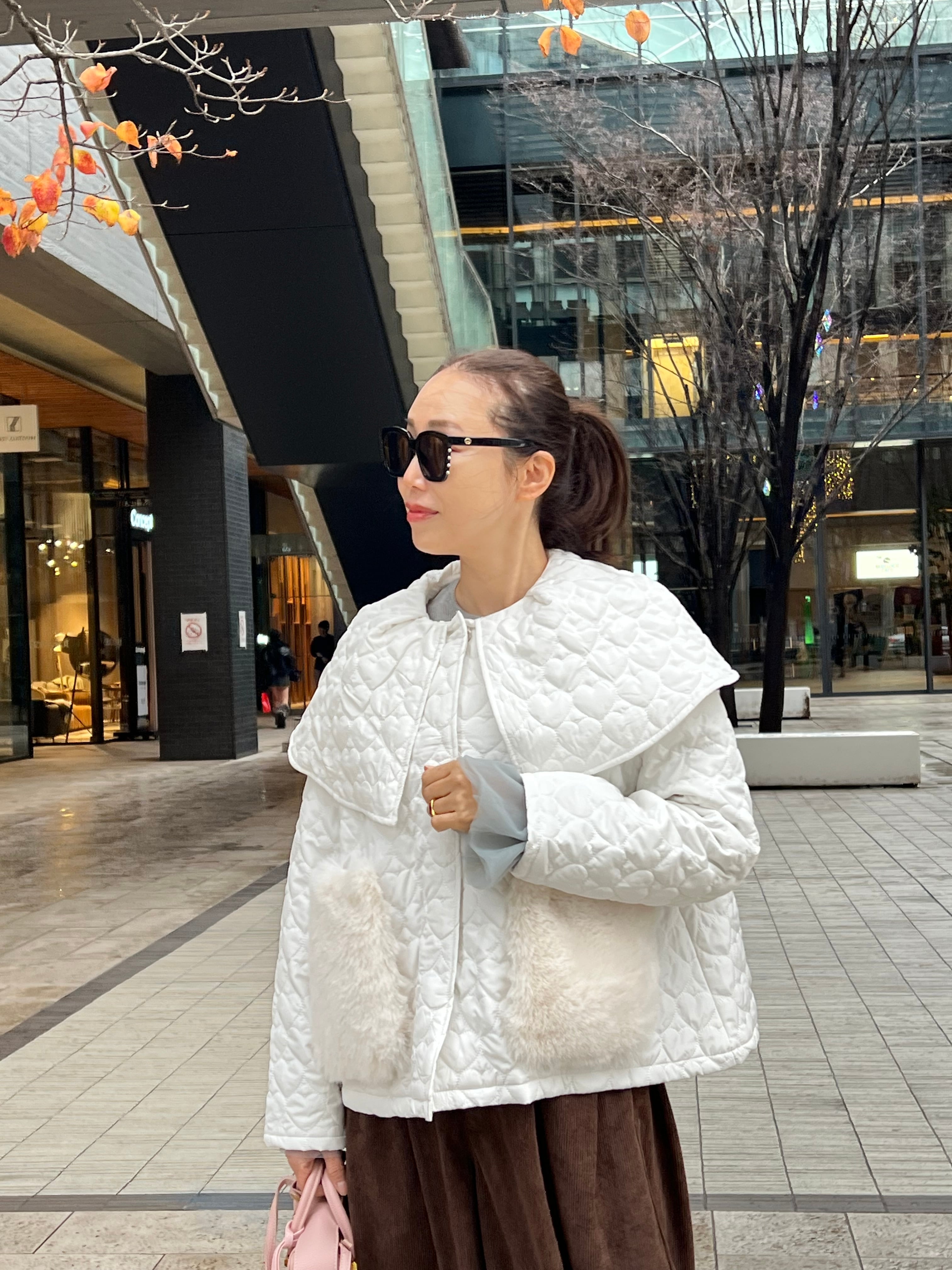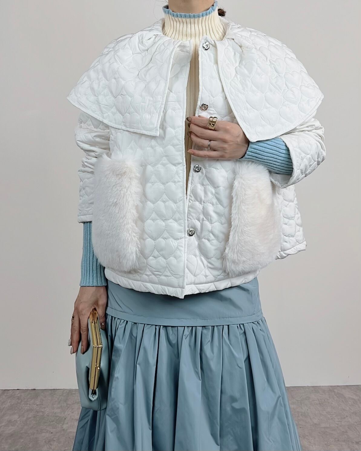 ハート柄がガーリーなキルティング生地を使ったアウター。