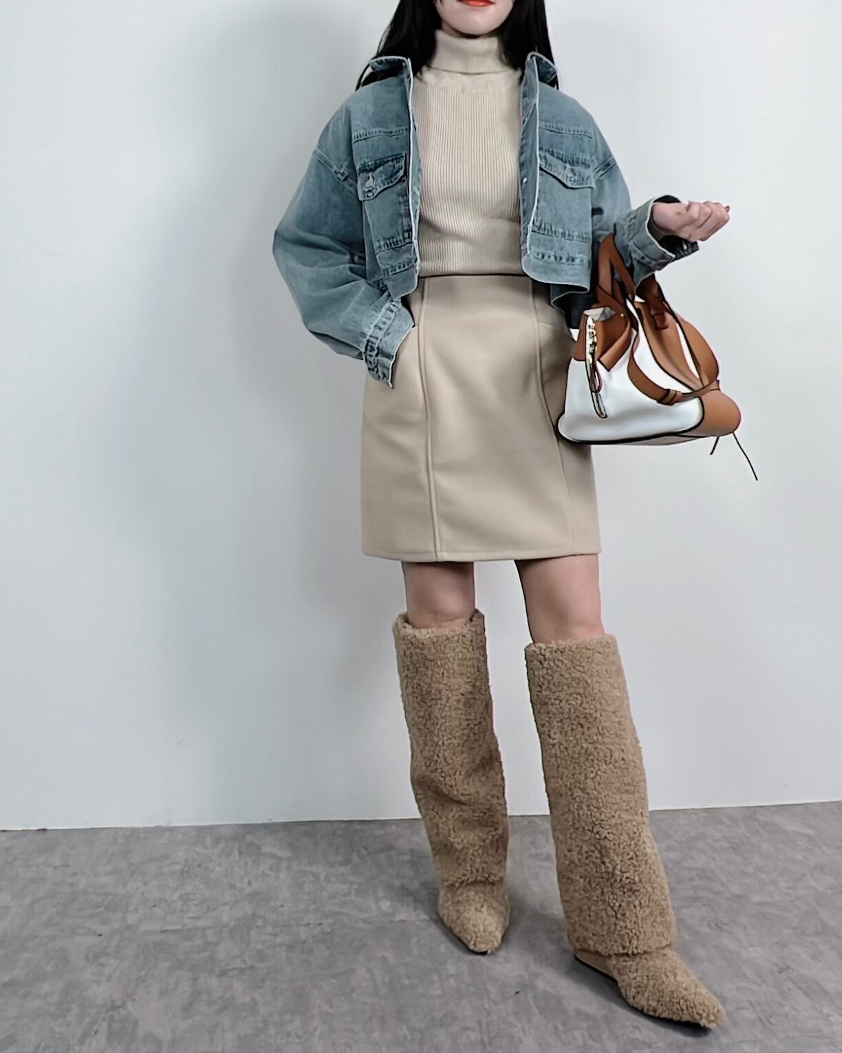 足元にはロングブーツを合わせるだけでトレンドコーデが完成します。