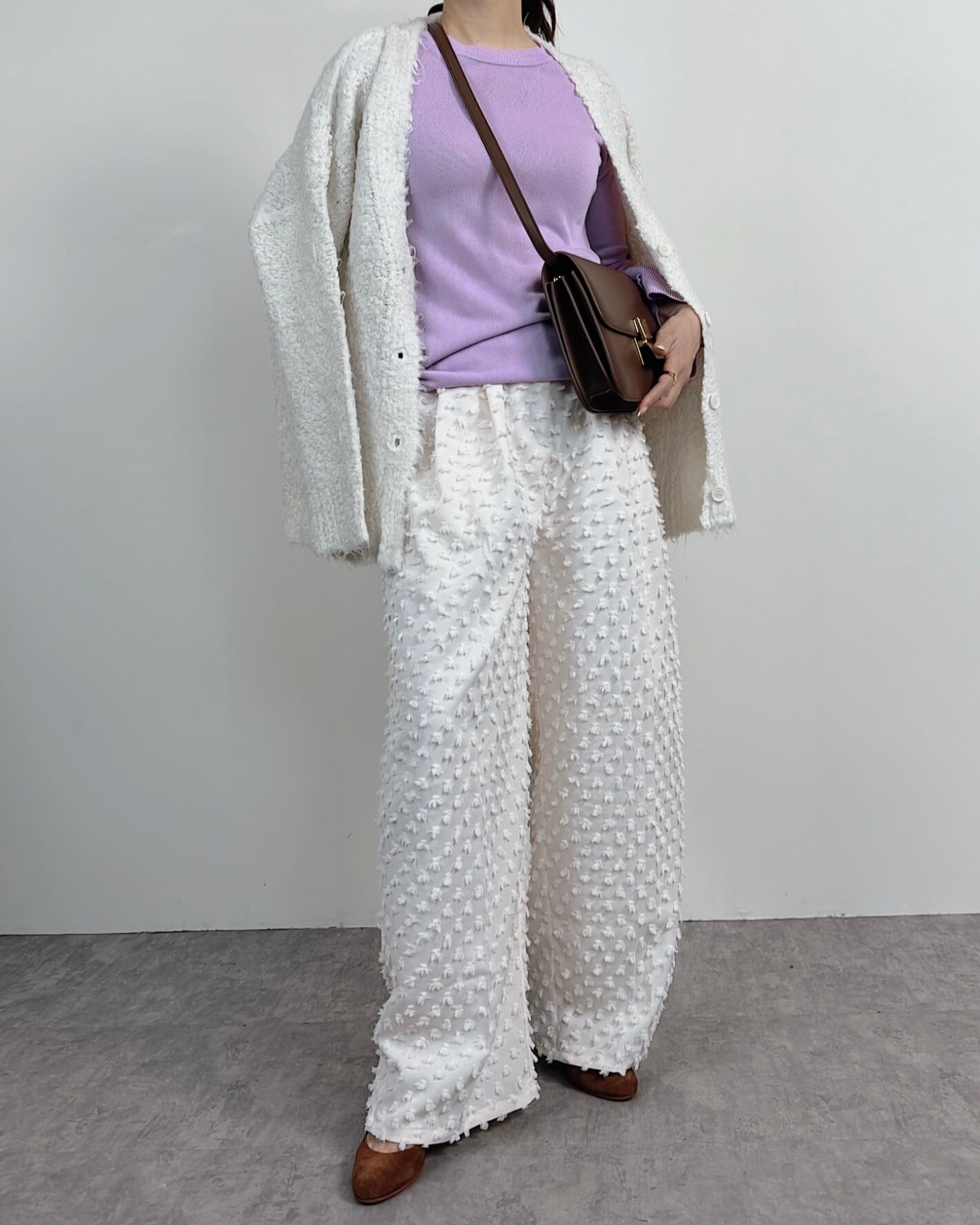 ゆったりとしたシルエットのブークレー素材が印象的なニットカーディガン。