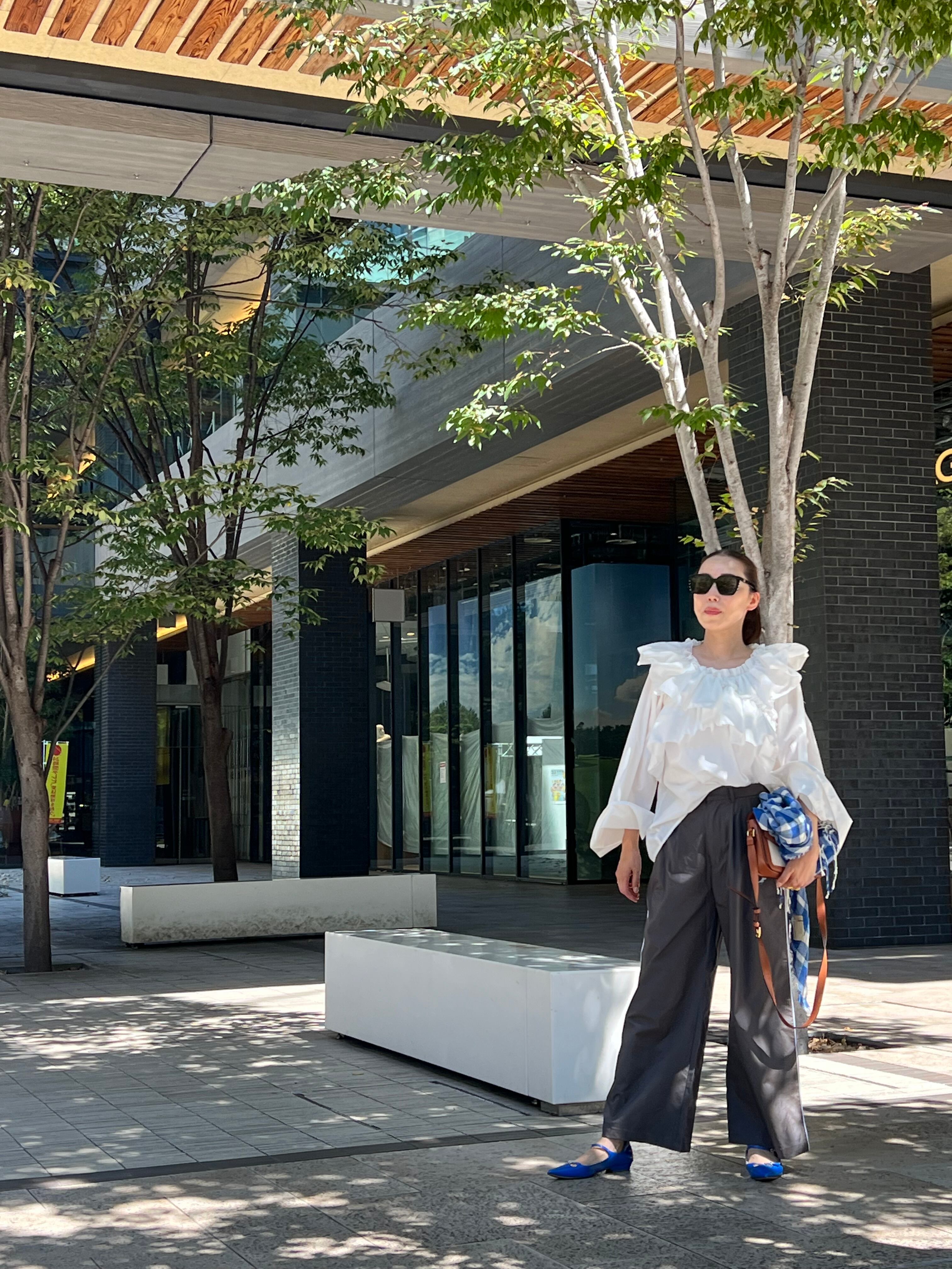 シャンブレーの光沢感が目を惹くタックワイドパンツ。