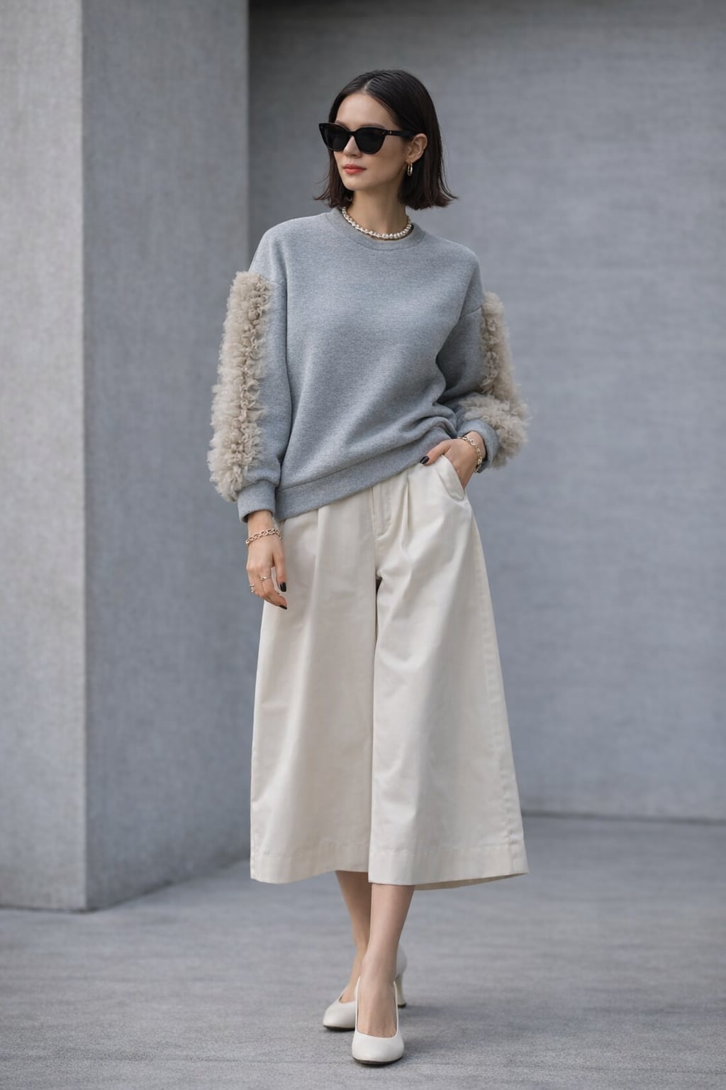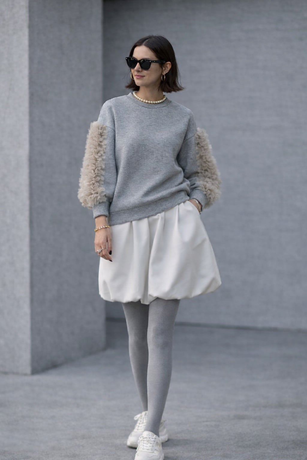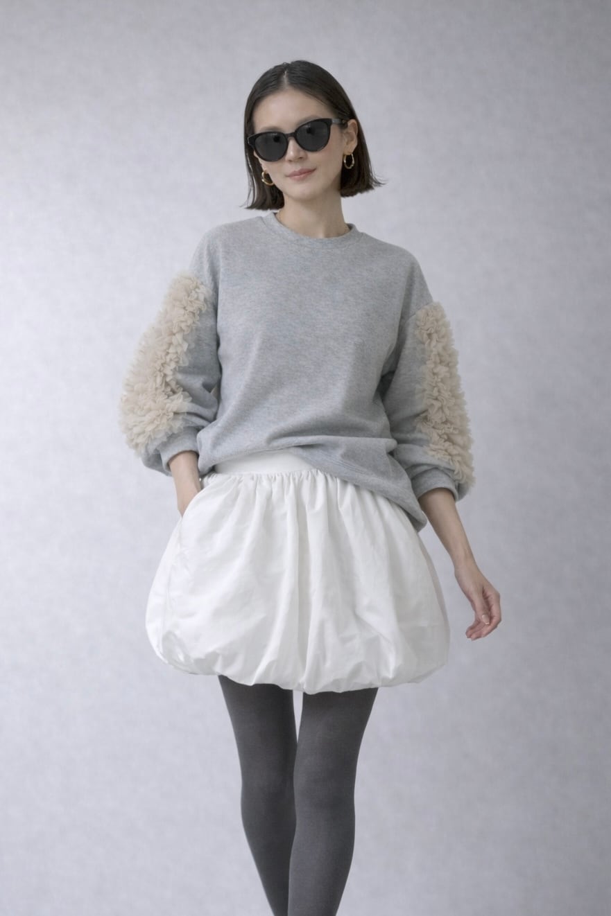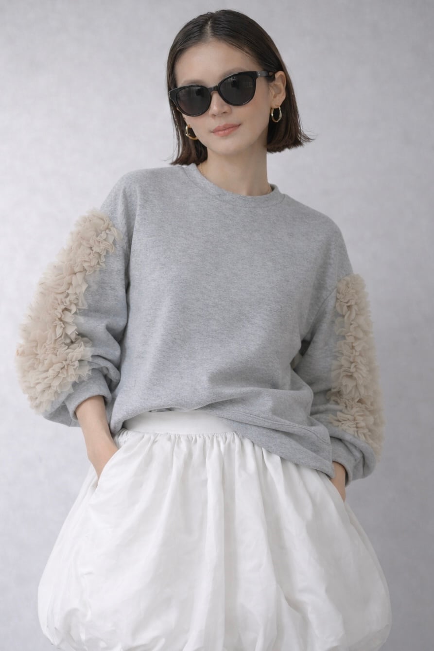 暖かさと華やかさを兼ね備えた裏起毛仕様のスウェットプルオーバー。袖には繊細なチュール素材を使用したフリルデザインを施し、女性らしい上品さをプラスしました。ふわっとした裏起毛素材で、肌寒い季節でも快適に過ごせるアイテムです。リラックス感のあるシルエットで、カジュアルスタイルにもフェミニンな装いにもぴったり。