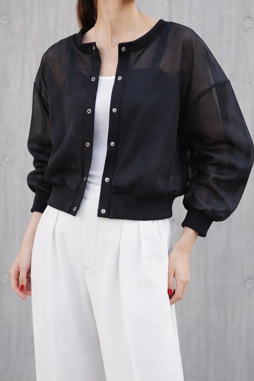 シアー感のあるダンボール素材の立体的な主役級カーディガンが登場!カーディガンとして着用はもちろん、前を閉めてプルオーバーとしても◎前後2WAYで着用可能なので様々な雰囲気をお楽しみいただけます。カジュアルな雰囲気と女性っぽさのある透け感のバランスがかわいい1着!ルーズな短丈シルエットでスタイルアップが叶います。フロントにはシルバーのリングドットをつけていて、デザインのポイントになっています。